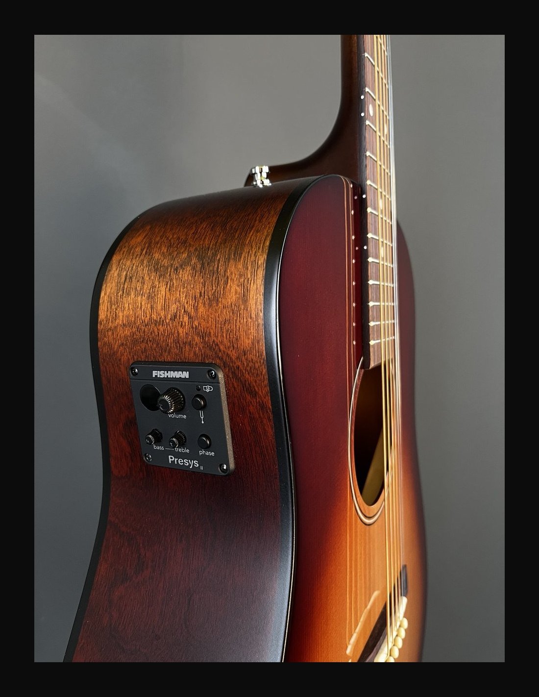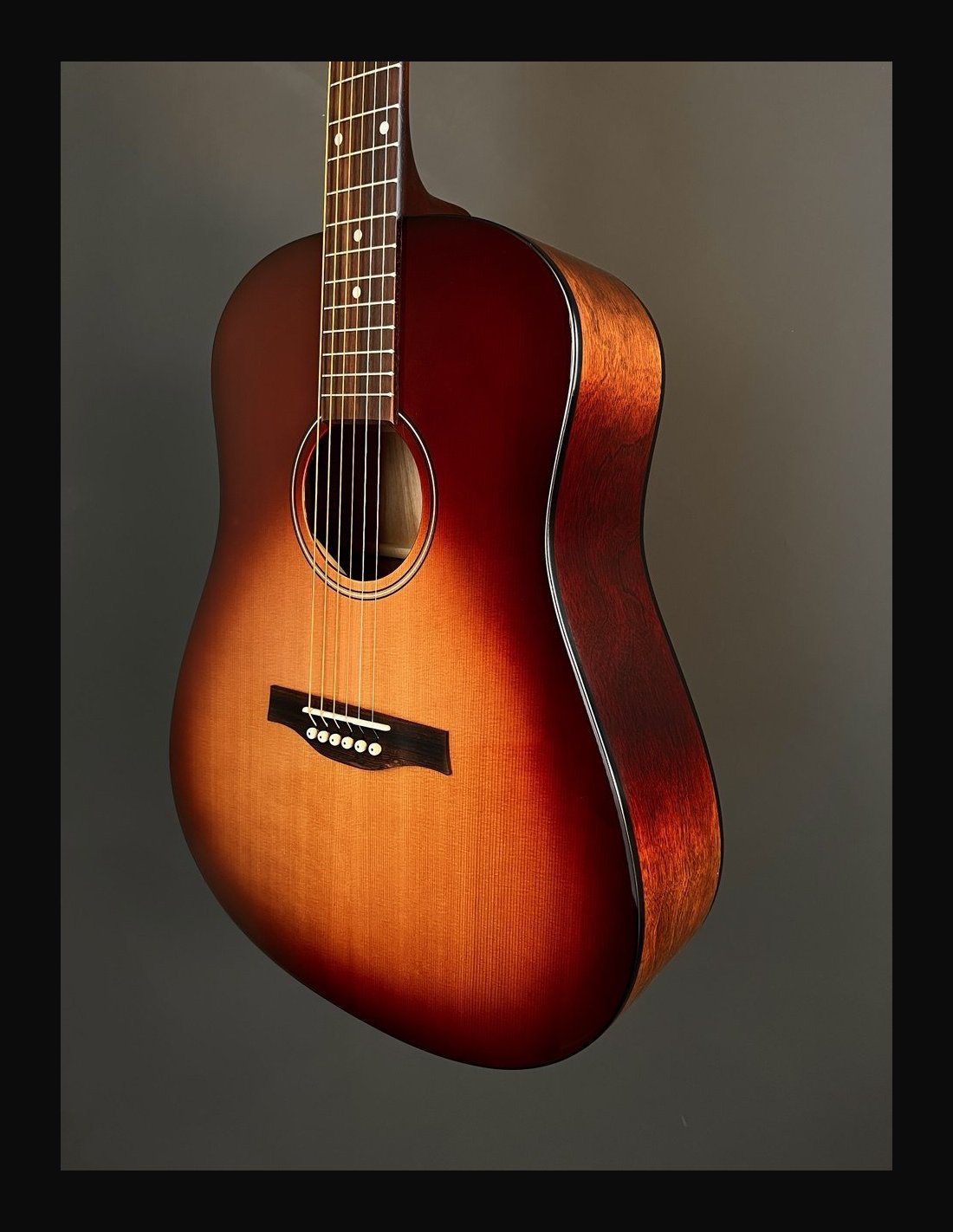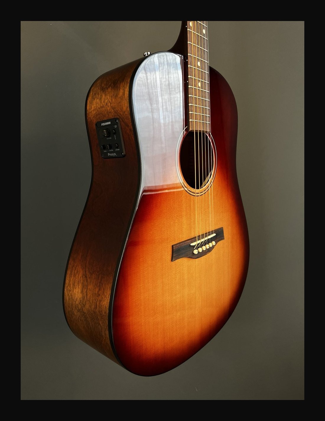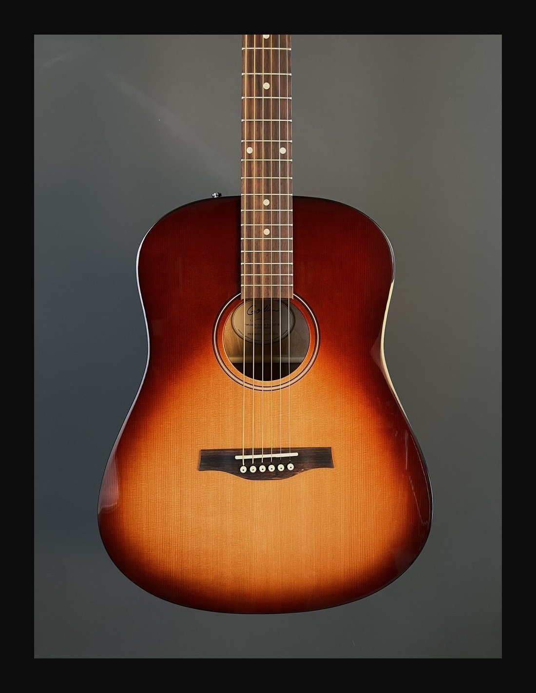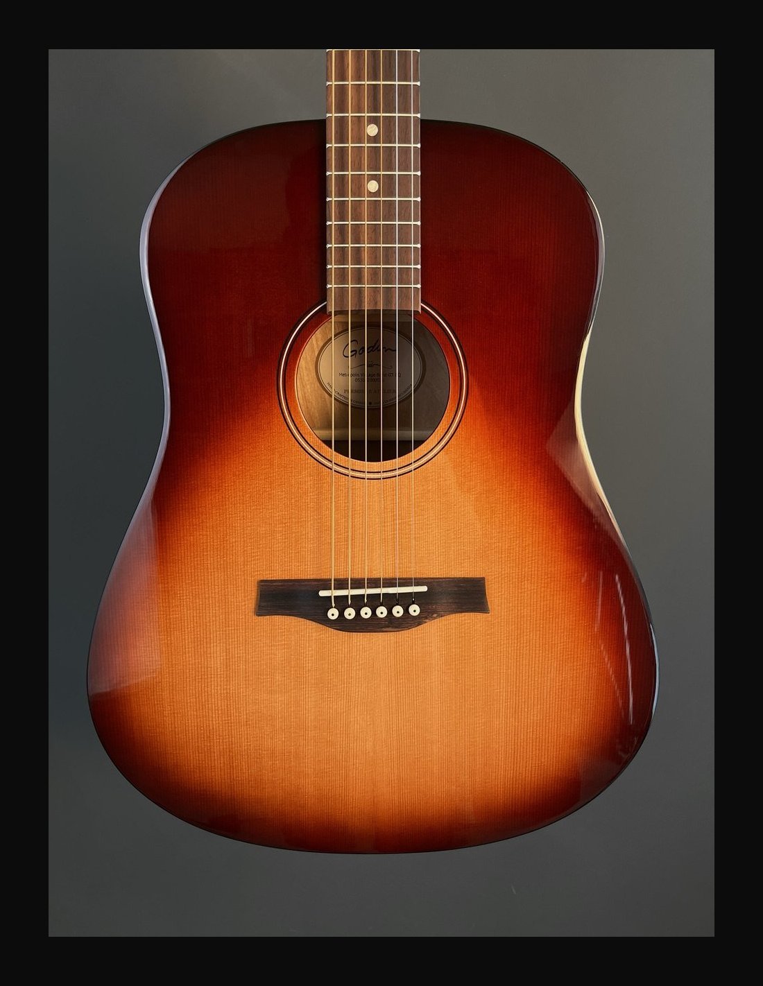 METROPOLIS VINTAGE BURST EQ - Chitarra 6 corde dreadnought elettrificata - Serie Godin Acoustic - Made in Canada - Lunghezza scala: 25,5" (647,70mm) - Top: cedro massello - Fondo: ciliegio canadese - Fasce: ciliegio canadese - Manico: acero - Ponte: palissandro - Tastiera: palissandro - Tasti: 21 - Radius: 16" - Capotasto: Tusq 1,72" (43,69mm) - Traversino: Tusq - Binding fasce: nero - Binding manico: nero - Binding paletta: legno - Rosetta - Intarsi tastiera: pearloid - Meccaniche: Godin 16:1 open gear cromate - Colore: vintage burst - Finitura: satinata con top lucido - Elettrificazione: Fishman Presys II - Borsa imbottita Godin inclusa.