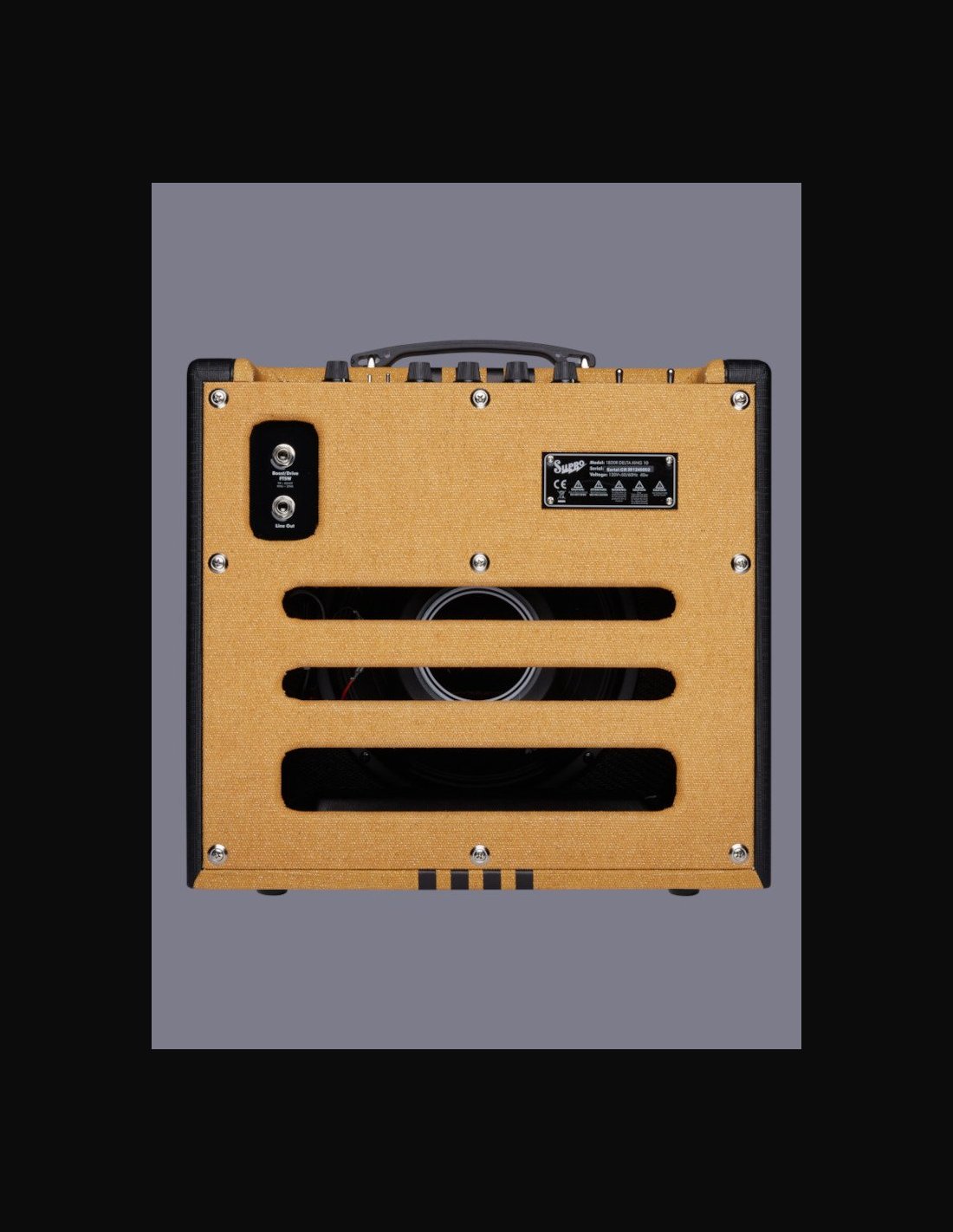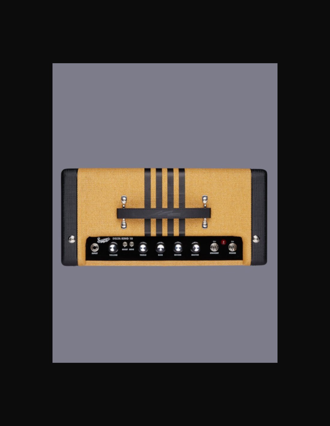 Delta King 10 Black/Cream Compare another model MODEL Name Delta King 10 SKU 1820RBC ELECTRONICS Wattage 5W Speaker Brand Supro Speaker Model DK10 Knob Controls Volume, Treble, Bass, Reverb, Master Effects Boost, Drive Inputs 1 Remote Switch Jacks TRS Double Footswitch Outputs (line level) Line Out Speaker Jack N/A Preamp Tubes 12AX7 Power Amp Tubes 6V6 HARDWARE Cabinet Material Poplar Handle Rubber Remote SF2 Supro Dual Footswitch (Sold Separatley) Cover N/A Tolex Black Piping Cream Colorway Black and Cream Grill Cloth Black BODY Cab Dims (in.) 16” x 7” x 15” Cab Dims (cm) 41 x 18 x 38 cm Weight (lbs) 23 lbs Weight (kg) 10.5 kg