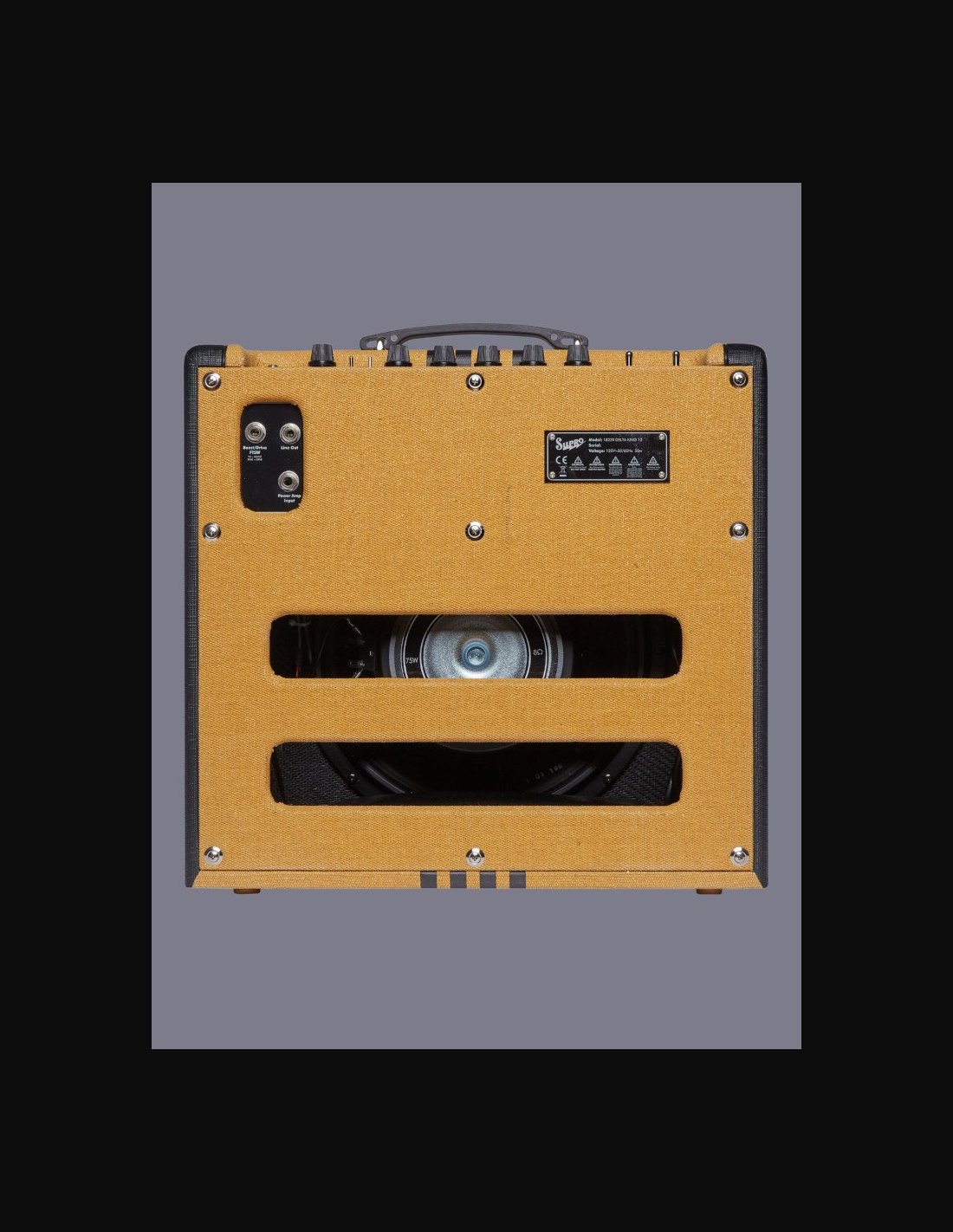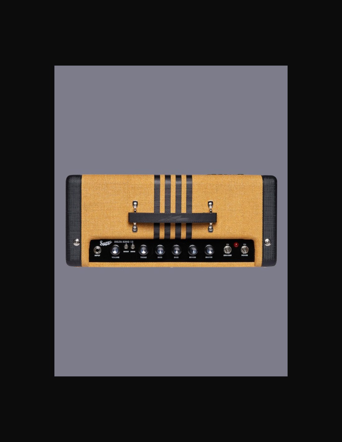 MODEL Name Delta King 12 SKU 1822RTB ELECTRONICS Wattage 15W Speaker Brand Supro Speaker Model DK12 Knob Controls Volume, Treble, Mid, Bass, Reverb, Master Effects Boost, Drive Inputs 1 Remote Switch Jacks TRS Double Footswitch Outputs (line level) Line Out Speaker Jack N/A Preamp Tubes 12AX7 Power Amp Tubes 6L6 HARDWARE Cabinet Material Poplar Handle Rubber Remote SF2 Supro Dual Footswitch (Sold Separatley) Cover N/A Tolex Tweed Piping Black Colorway Tweed and Black Grill Cloth Black BODY Cab Dims (in.) 17” x 7.5” x 16” Cab Dims (cm) 43 x 19 x 41 cm Weight (lbs) 28 lbs Weight (kg) 13 kg